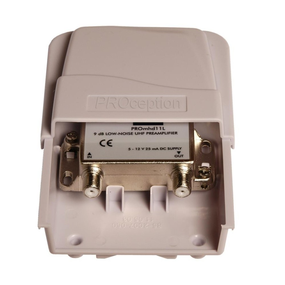High-performance low-noise pre-amplifier of upto 27db of Gain with a Low Noise Figure of 1.8dB, power can be in the range of 5 to 12 volts at 50 milli Amps, this power range will alow delivery of power direct from certain digital terrestrial set-top boxes or IDTVs which can provide 5 V output at the aerial socket.