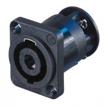 NL4MP-ST 4 pole chassis connector, black D-size flange, countersunk thru holes, screw termination. This chassis connector is not airtight. The speakON panel mount connectors are the standard chassis connectors for loudspeaker / amplifier interconnections. They feature a unique metal locking system, making contact only once fully locked. The speakON receptacles are robust, versatile and easy to terminate.Features