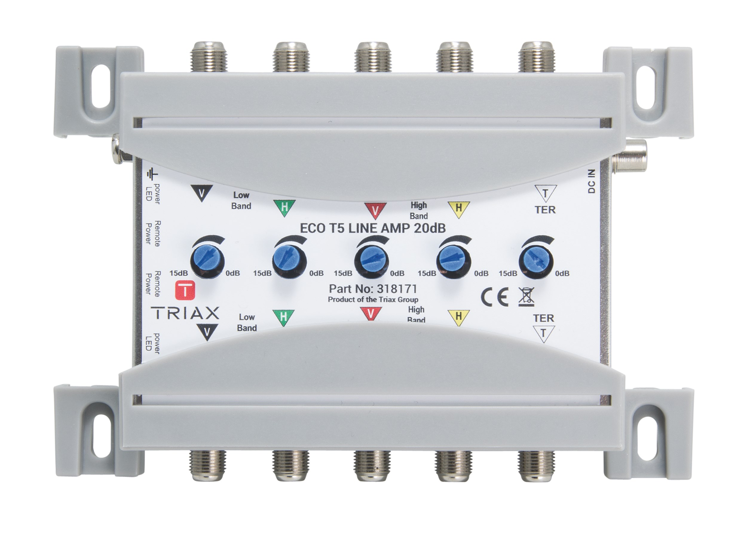 The T5 Line Amplifier with 20dB Gain per amplifier of 1 x Terrestrial and 4 x Satellite, The five Launch Amplifier System has 5 In 5 Out fitted with F Type Ports, the unit has high interference immunity by fully screened housing.