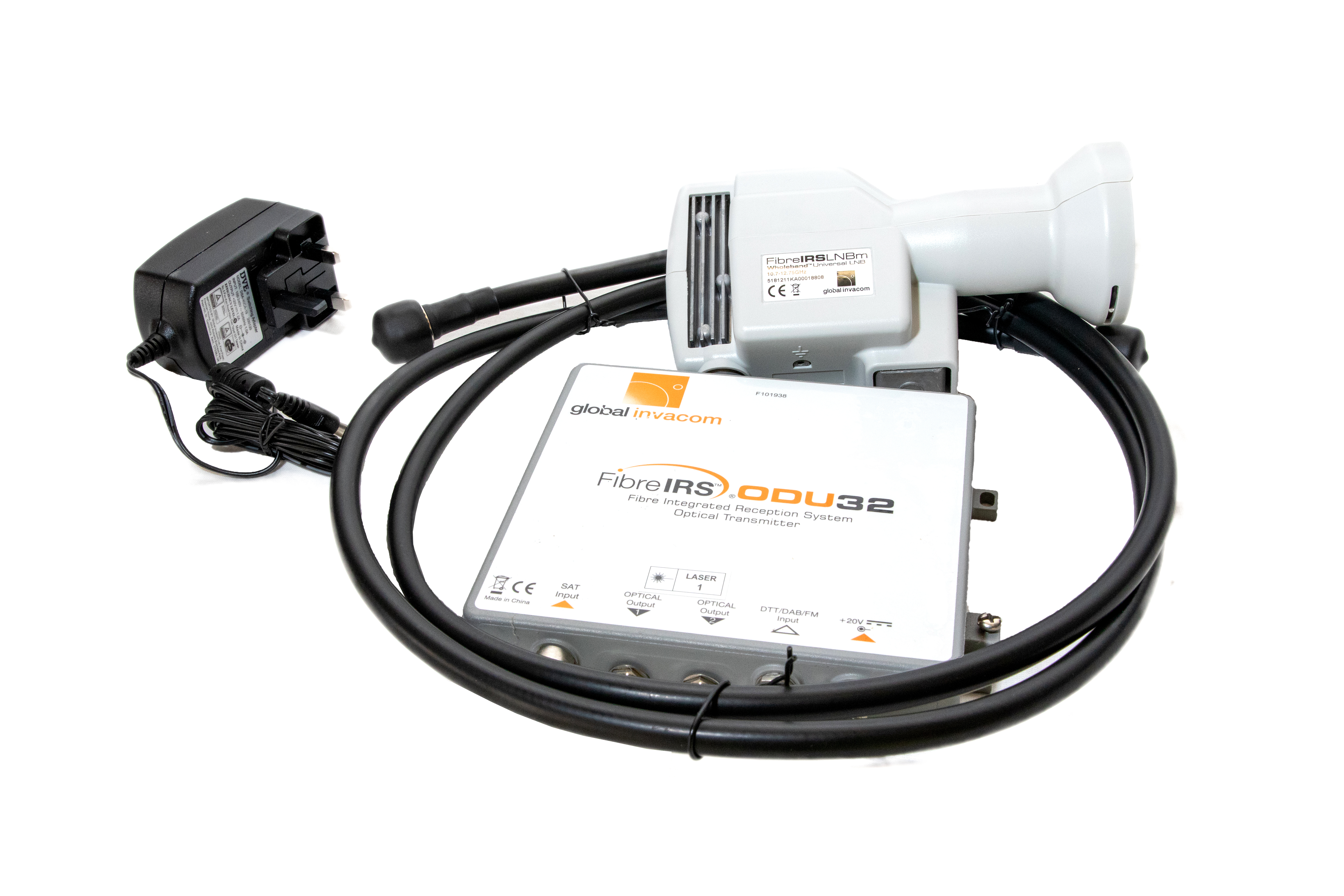 The GI - FibreIRS®-ODU32 KIT contains, Wholeband LNB, FibreIRS® ODU32, 2m HF Interconnect cable, PSU, weather proof boots for the FC/PC connections.